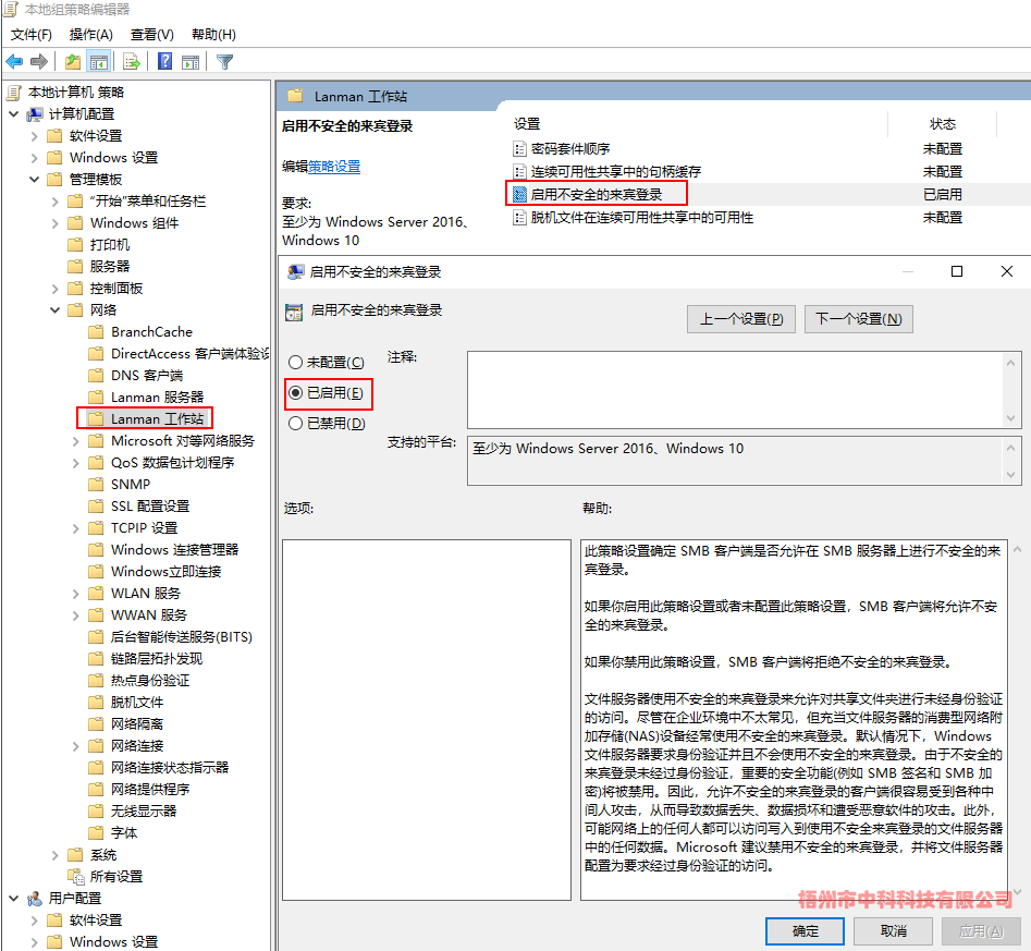 (3)計(jì)算機(jī)配置->管理模板->網(wǎng)絡(luò)->Lanman工作站->啟用不安全的來賓登陸->已啟用